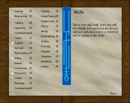 This is the skillbook. Very self explanatory ! You can see how many points you have in each skill. Now here is a description of each skill and what it do: Cooking This comes into play when you are trying to roast a meat on a camp fire for instance (USE meat then click on camp fire). Better the skill, the faster it goes ! Musicanship Not working yet. Tailoring Comes into play when you are either making hide into cloth, cloth into folded cloth or when you are trying to make clothing out of folded cloth (See the Beginners Tutorial for how to use these trading skills.) Better the skill, the faster it goes. Carpenting Comes into play when you are making planks out of logs (See the Beginners Tutorial for how to use these trading skills.) or making a wooden object out of planks. Better the skill, faster it goes. Lumberjacking Comes into play when you are chopping wood of a tree using a lumberjack axe. Simply equip the lumberjack axe and click on a tree. Better the skill, the faster it goes. Tactics Comes into play when you are fighting. The better the skill, less chance your foe will have hitting you. Disguise If you click on the diamond infront of this skill you may or may not depending on how high your skill is, change name to "a peasant" so people will have a harder time to find you ! Merchant Very valueable skill ! The better skill, the better prices you get when trading with a NPC. If your skill is over 70, you will actually MAKE money when trading with NPC`s. Blacksmithing Comes into play when you make ore into steel or when you make steel into an object (See the Beginners Tutorial for how to use these trading skills.). Better the skill, the faster it goes. Hiding If you click the diamond infront of the skill you will dissapear. Make sure you have unequipped your shield and weapon or else people wil see this. The better the skill, the less time it takes for you to hide. Also, creatures will not attack you if you are hiding ! Magery The better the skill, faster it goes to cast a spell. Lockpicking Not working yet. Stealth Not working yet. Poisoning Not working yet. (This skill we work something like this: When you poinson someone, you have to stand right beside them and it may take a while to poison them depending on your skill. If they move away for you before your done, the poisoning will be unsucessful.) Swordmanship Works just like the tactics skill, only the difference is that the higher your swordmanship skill are, the better chance of hitting your foe. Parrying How good you are defending yourself. Your foes hit on you may go severely down depending on your parrying skill. Animal Taming Comes into play when you try to tame an animal. Not all animals can be tamed at all skill ratings. For example, you may need 10 in animal taming to tame a deer, and 98 to tame a cyclop ! Better the skill, faster it goes to tame the animal. To tame a animal, target it and type /TAME Region Lore Comes into play when you pray to a priest or priestess. To pray, target a a priest or priestess and type /PRAY. This skill is sucess or not based. If you are sucessful, the god will grant you a miracle. After you reach certain stats rates, they will not give you any more miracles. Fishing Comes into play when you equip a fishing pole, and then click on water. The better the skill, faster it goes. Fish can be cooked or sold. Mining Comes into play when you equip a pick axe, and then click on one of the big stones or some cliffs. Better the skill, faster it goes. Eventually you will end up with some ore. Backstabbing The first hit you make on your foe may be more deadly than the others. Your backstabbing skill be checked, and if sucessful, the hit may cause alot of damage. Healing Better skill you have, the faster it goes when you heal. Remember, you will not automatically heal if you havn`t any food or drink on you (see the Flora & Food section.). Also, if you target someone (including yourself), and then USE a bandage you will heal a certain amount of health. Better the skill, faster it goes applying the bandage. You can also heal by sitting with a camp fire, but this has nothing to do with the healing skill. Surviving We will expand this much further. Currently, it comes into play when you make a camp fire. Simply drop a log onto the ground and click it. Better the skill, faster it goes starting the camp fire. Ettiquette Better the skill, better noble people and other high standing people will treat you. Streetwise Better the skill, better traders and common people will treat you. Meditating To regain mana, simply type /MEDITATE and you will begin meditating. The better the skill, the faster it goes. Archery Archery is not implented yet. Expect it to be soon ! Ok, now when you have gained a certain amount of experience, you will be awarded 5 training points and your stats will raise abit (see the Improving Yourself section). You can now use these training points by going to a professional trainer, target him and type /TRAIN. This will bring up a training window. Click the number of the skill you wish to raise and you will spend a training point on that. PS! Skills will not raise themselves by use until you have 10 points in that skill. You will have to use training points to get the skill up to 10, after that it can raise itself by repeated use. We use this system because it make classes more unique and you really have to work with a skill to get good in it. Skills will also raise themself after repeated use. This may be a slow process. The game will tell you when a skill has gone up. Note that only specialized skills may surpass 50 points. You select what you want your specialized skills to be when making the character. Specialized skills appear in red in your skill book. You can only have three specialized skills. We have this system, because it discourage people to be power gamers (getting all the best stuff, getting all maxed out skills etc.). Now you really have to work with something to be really good in 
